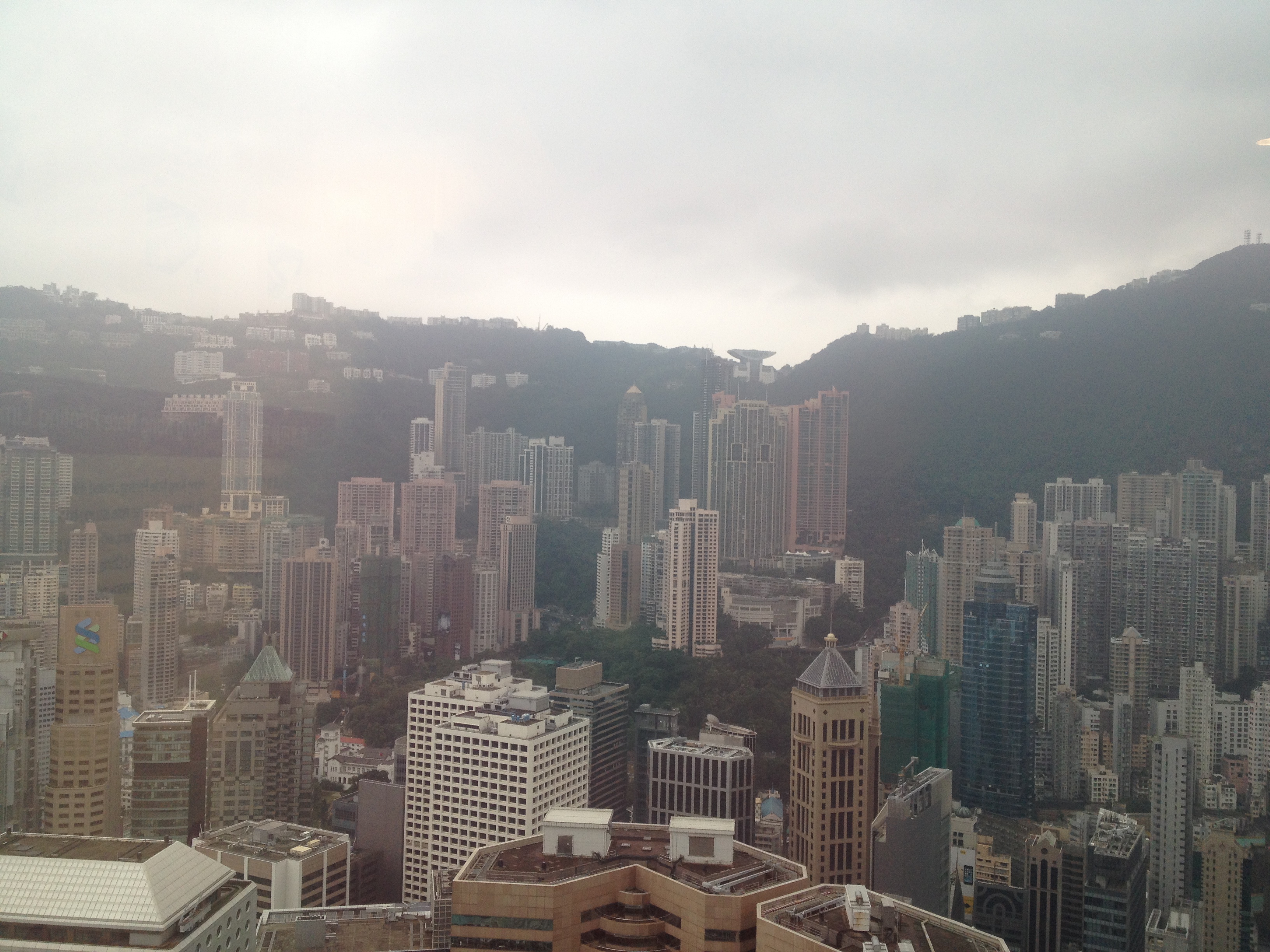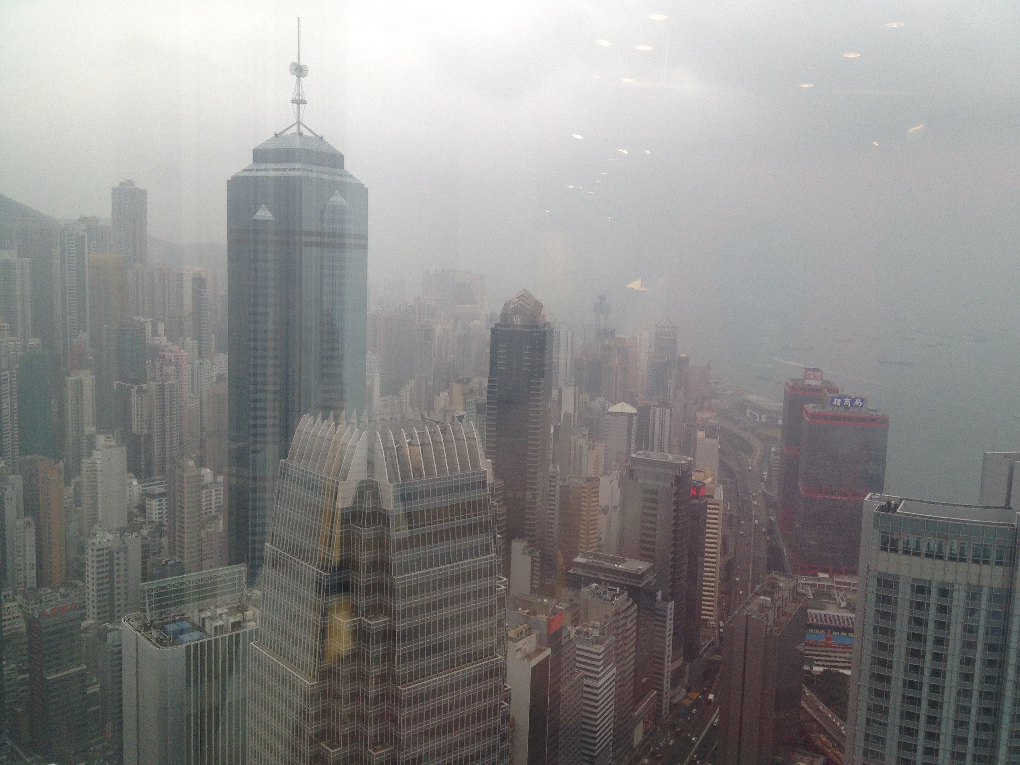 First up is the Bank of China Tower which is the building designed by I.M. Pei and is, all-in-all, pretty spectacular and is the most recognizable out of all of the buildings in Hong Kong. It’s the one Feng Shui experts don’t like because of it’s hard lines and angles. Boo hoo, it looks pretty cool to me and was my first stop on my skyscraper tour. Please note that a valid photo ID (passport, driver’s license, etc.) is required upon entry or else you won’t be able to get in. They use your name and assign you an ID that gets you up to the 43rd floor. I happened to visit the observation deck on a somewhat cloudy day so visibility was limited but I could still see the other buildings. I was treated to this spectacular view of most of Central Hong Kong and some of Kowloon: