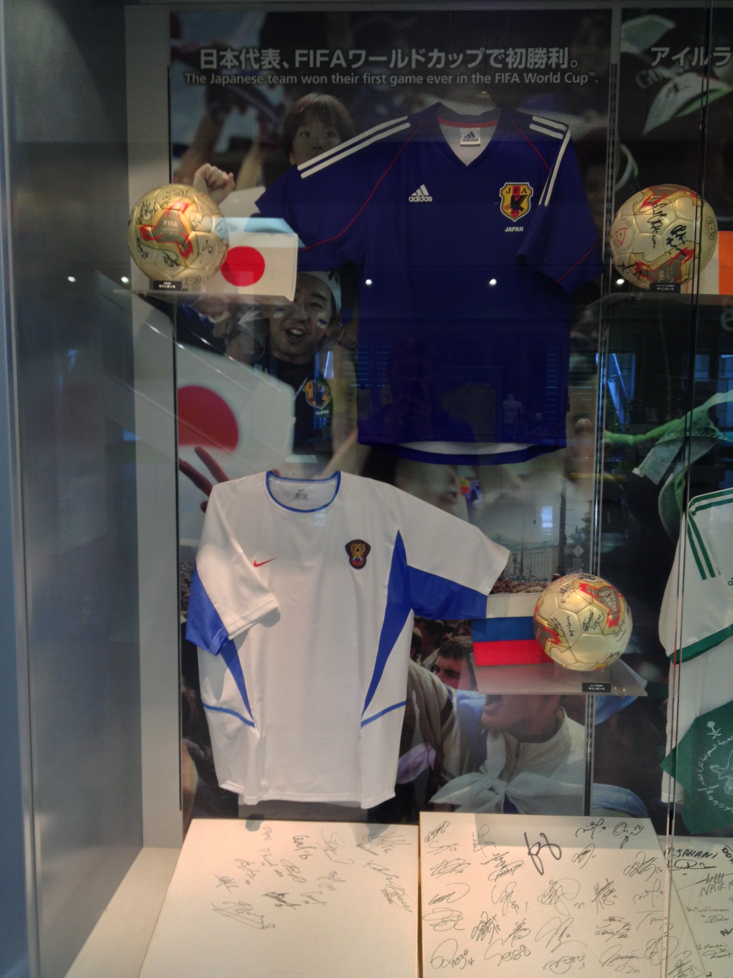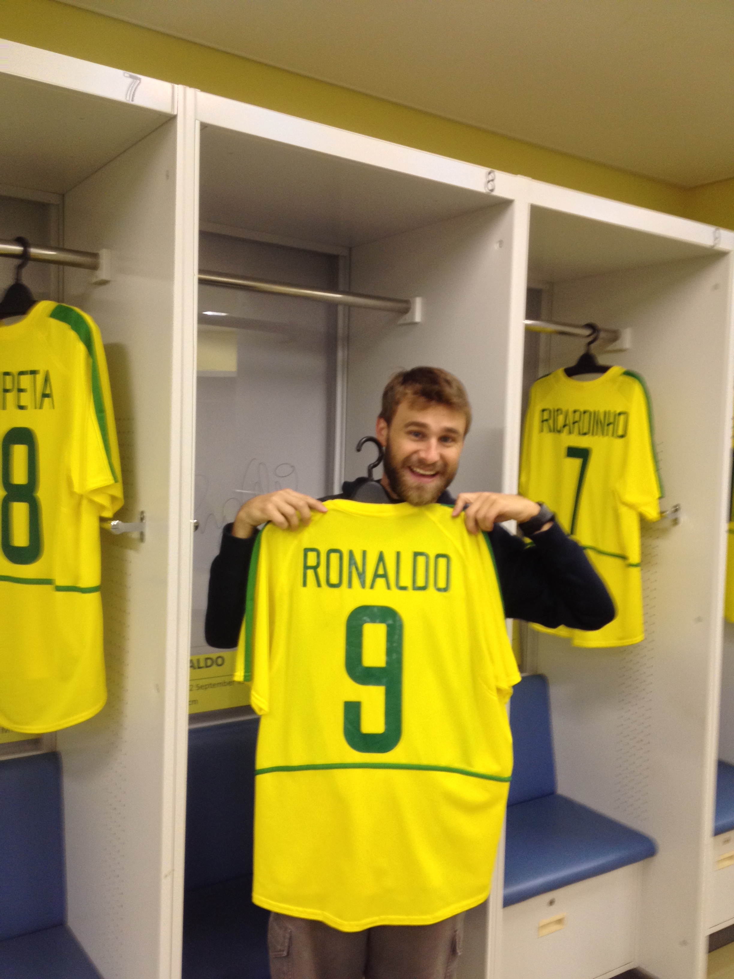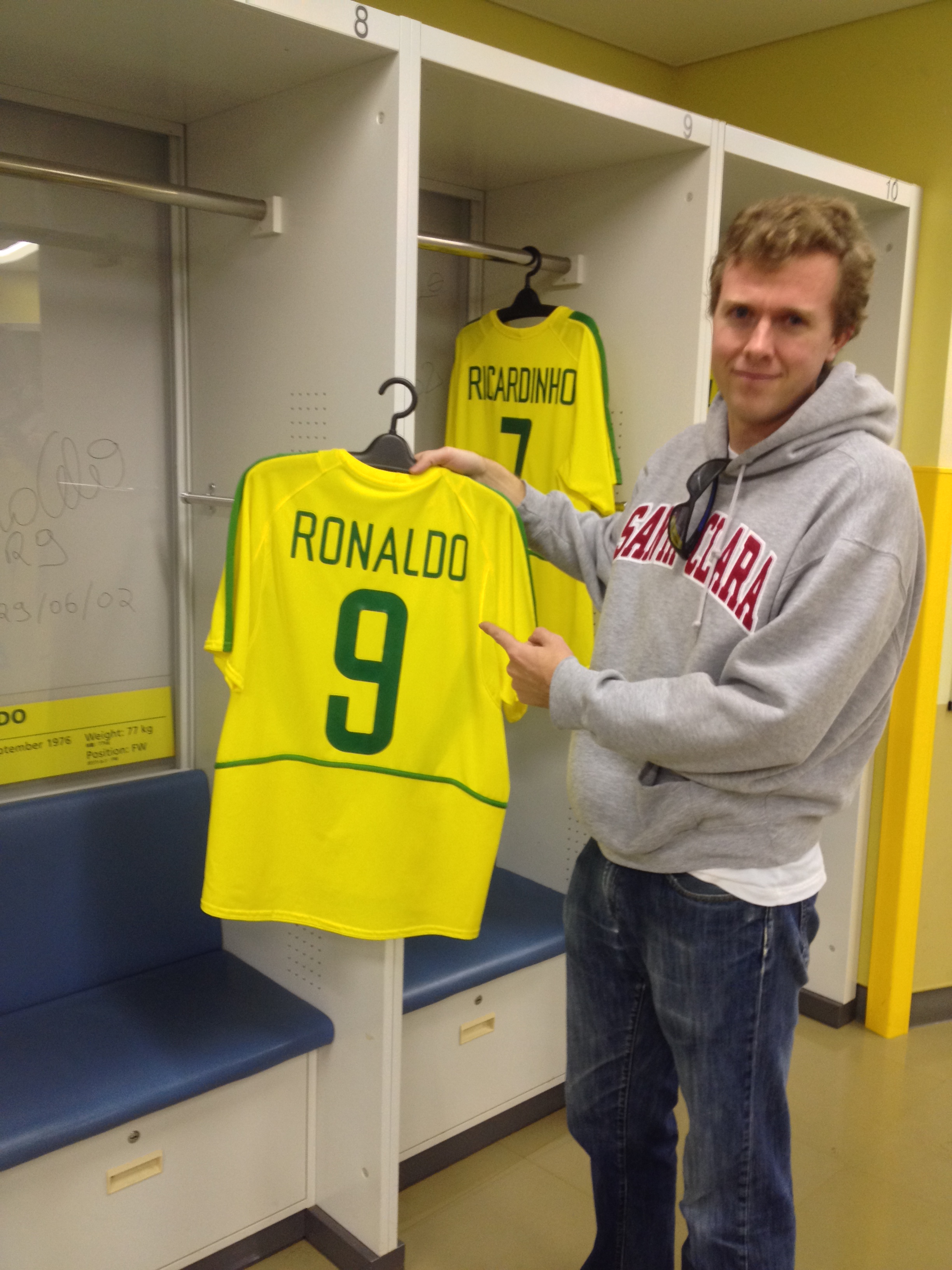 Once down on the field level we really got the scope of the stadium and just how massive it really is and how loud it must have been on the night of the final. Speaking of the final, what must have it been like to be in that winning locker room? I’ll show you! While it is impossible to recreate the moments and atmosphere of that event, the Japanese do a great job preserving the memory of the final. Upon arriving in the locker room we see jerseys of each player hanging in their respective locker and it was hard not to get giddy at the fact that we were standing where Brazilian greats like Ronaldo, Roberto Carlos, Kaká and Ronaldinho once stood and celebrated. They also had each player sign the wall behind their locker and they then encased in in plastic to preserve it. They also preserved the white board coach Luiz Scolari used on which he predicted that they would win based on adding up the years previous champions, Germany and Argentina, had won and they all equaled the same total. He also boldly predicted, based on this equation, that they would win again in 2006 in Germany – not so much.