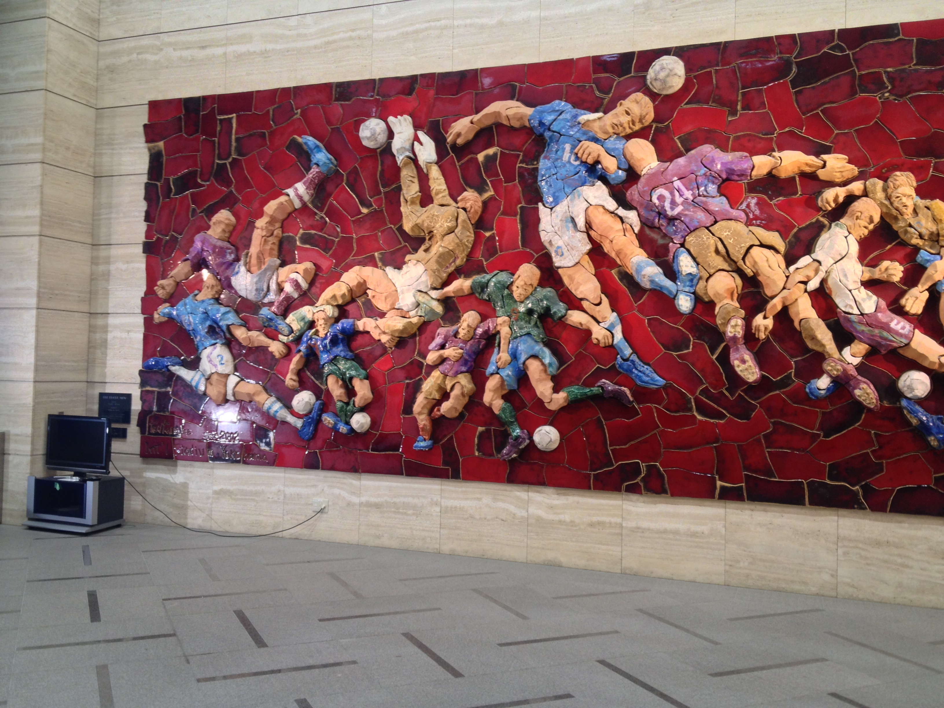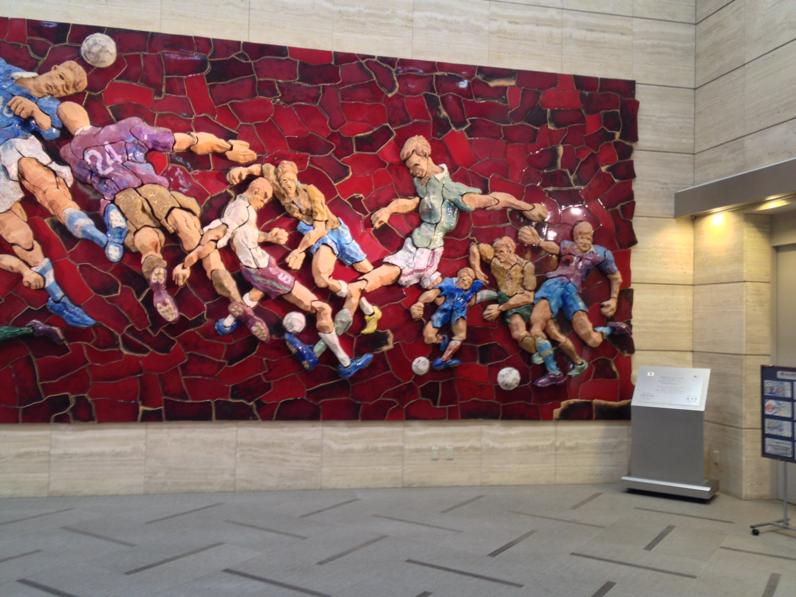 After barely making a goal, the ball just slid inside the “post”, we were led to an area that housed many items of memorabilia from the tournament. Items like signed jerseys, balls, and programs from different matches throughout the World Cup played at the stadium and just beyond that, is a gigantic mural pieced together artfully depicting “The Beautiful Game”.